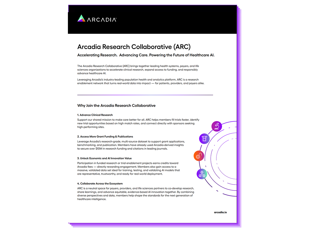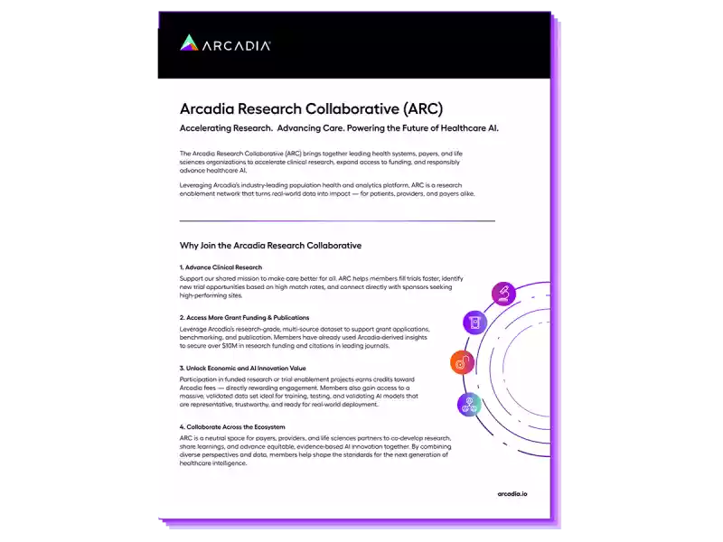 The Arcadia Research Collaborative (ARC) convenes leading health systems, payers, and life sciences organizations to accelerate clinical research, expand access to funding, and responsibly advance healthcare AI.