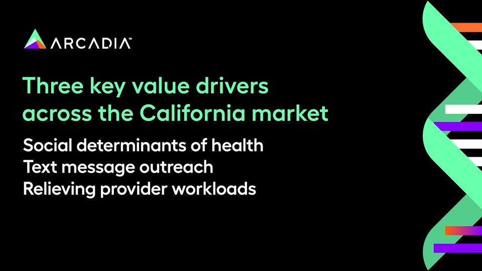 Putting the value in value-based care is no easy task, but in a state full of start-ups and visionaries, the solution to costly, widespread SDoH problems lies at the intersection of technology and humanity. With Arcadia’s data and predictive analytics, you don't have to choose between caring for the most vulnerable Californians and future-proofing your organization. Stable, healthy populations meet stable, healthy bottom lines. Let’s collaborate.
