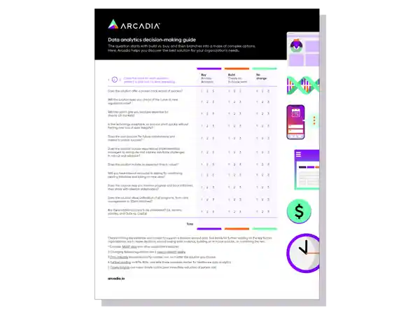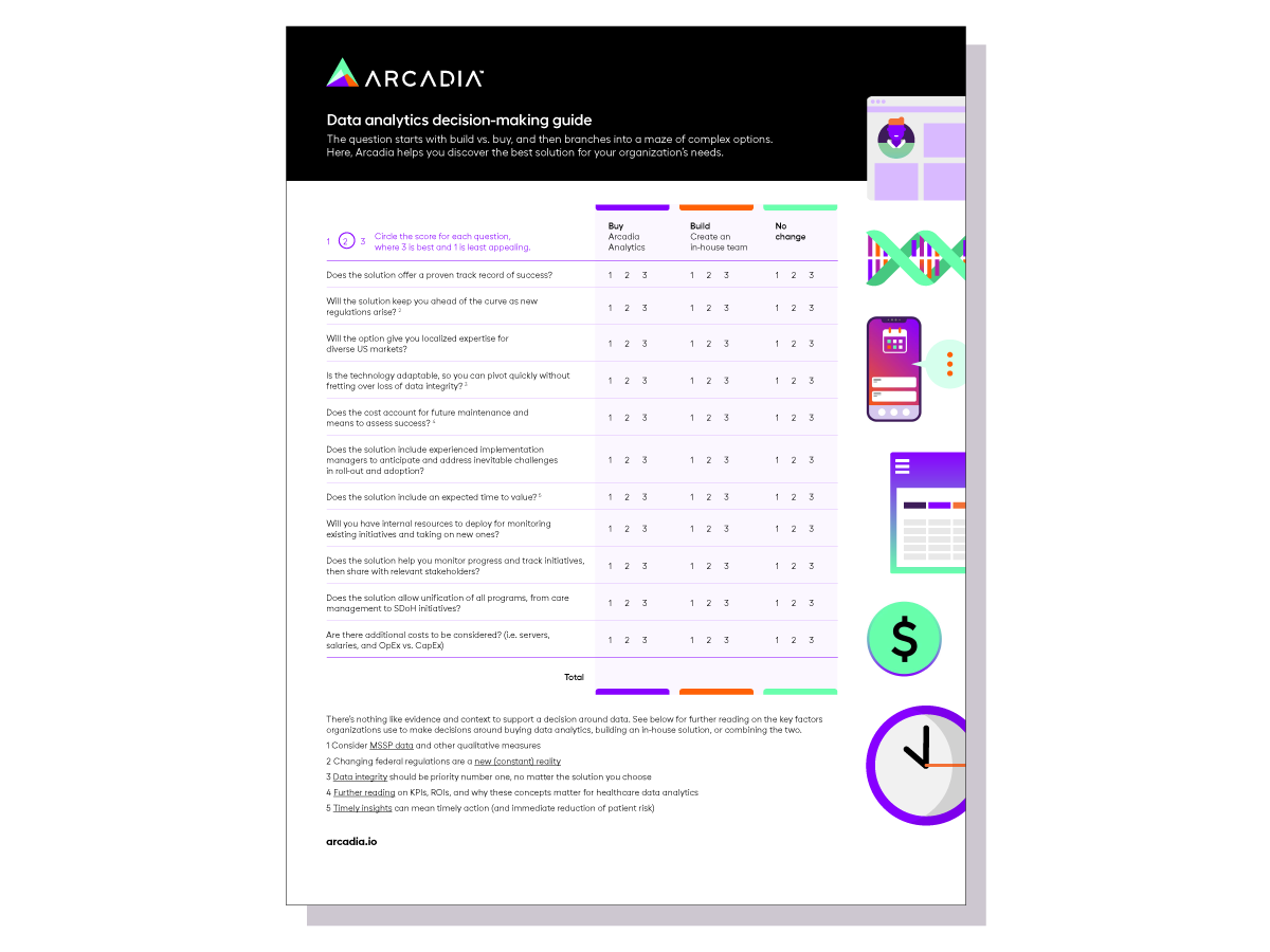 Arcadia helps healthcare organizations bridge the gap between build vs. buy with an analytics platform that helps you succeed out of the box, but is flexible enough for your team to put your data to work in new and unique ways. Schedule a time to see it in action.
