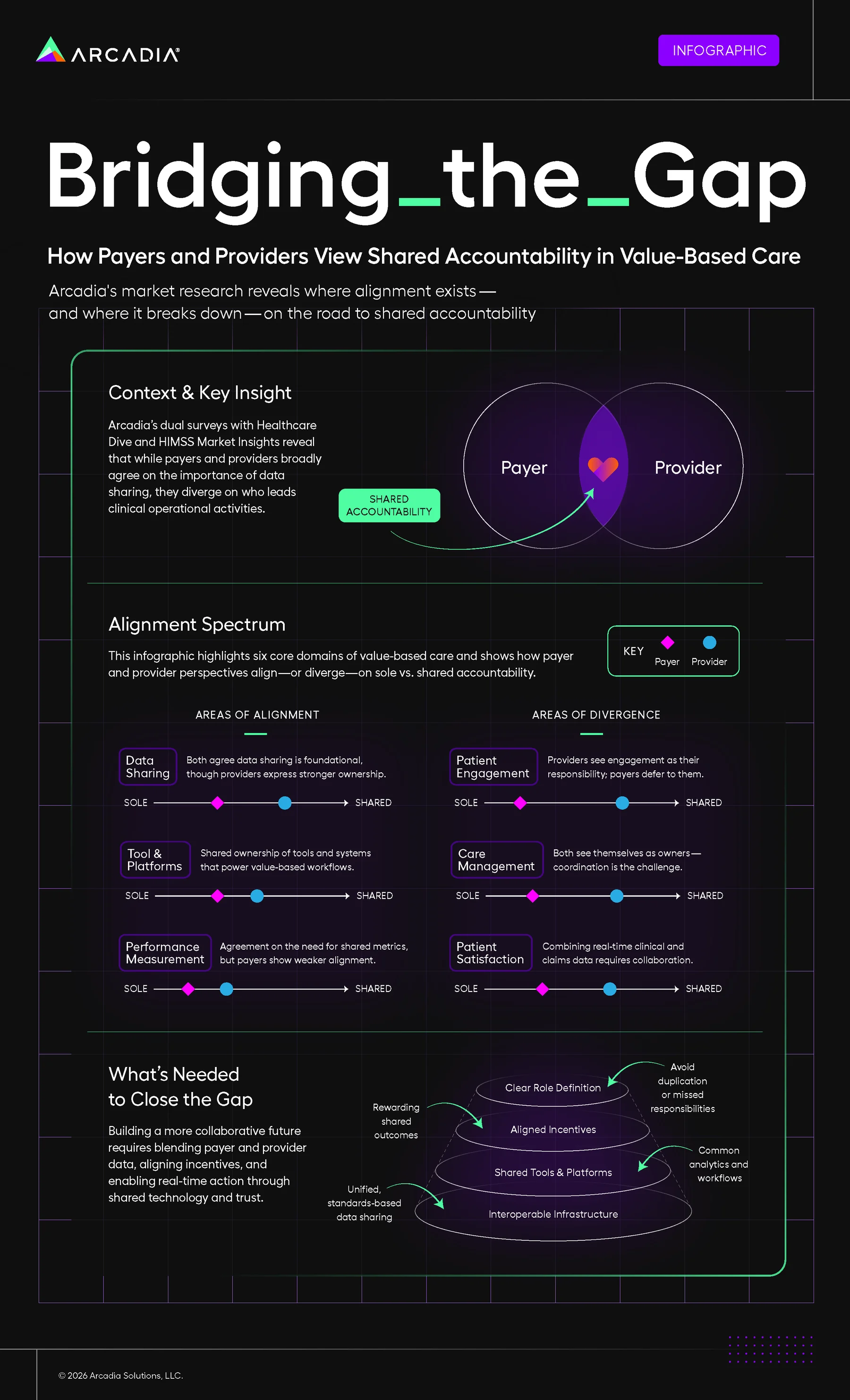 To better understand these dynamics, Arcadia partnered with Healthcare Dive and HIMSS Market Insights to survey payer and provider leaders on how they define accountability across six key domains. The results reveal both promising areas of alignment and persistent disconnects that stand in the way of progress.