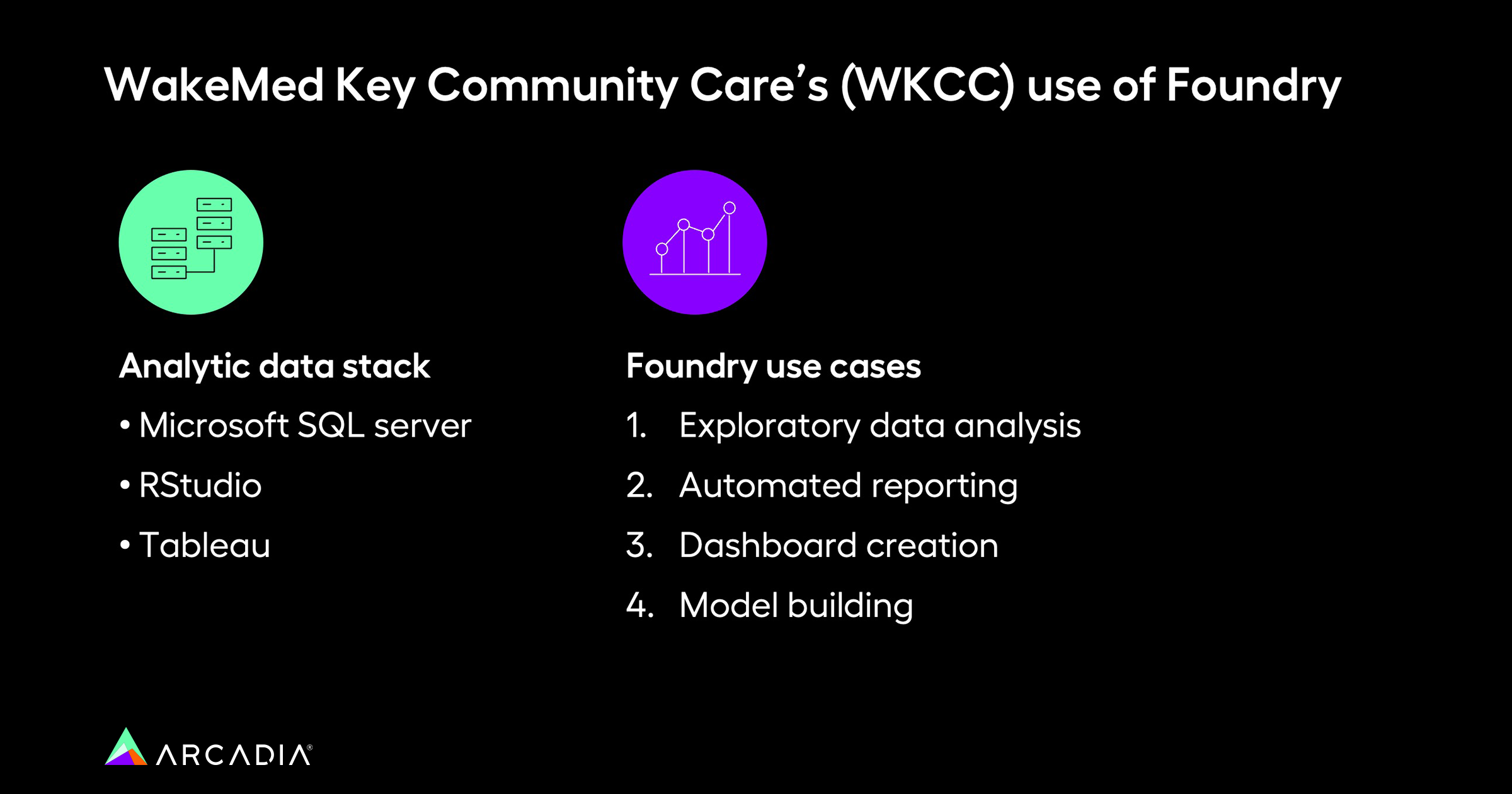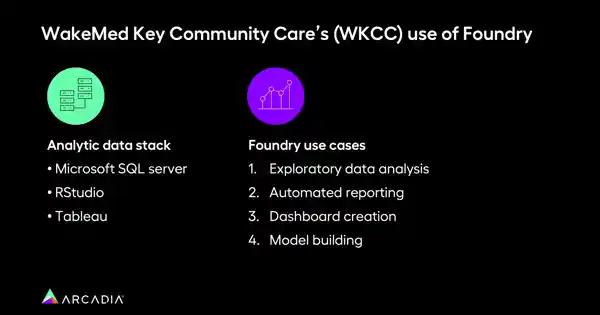 Jon O'Neil, Director of Analytics and IS at WakeMed Key Community Care (WKCC), shared insights into how his organization has used Foundry. Their team leveraged Foundry, along with Microsoft SQL Server, RStudio, and Tableau, to create a powerful analytics stack that connects their data and streamlines their reporting process.