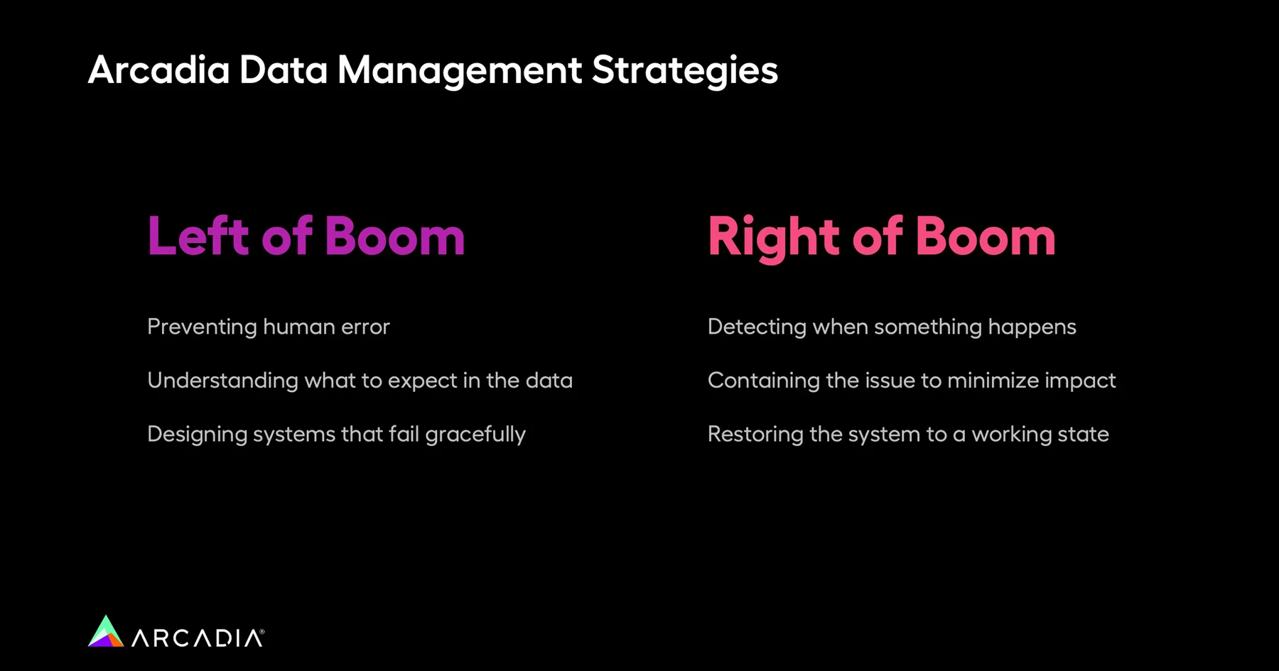 The most important right of boom strategy is containing the issue to minimize its impact and keep data operations moving smoothly until its fixed. This is something Mary refers to as a “data seatbelt.”