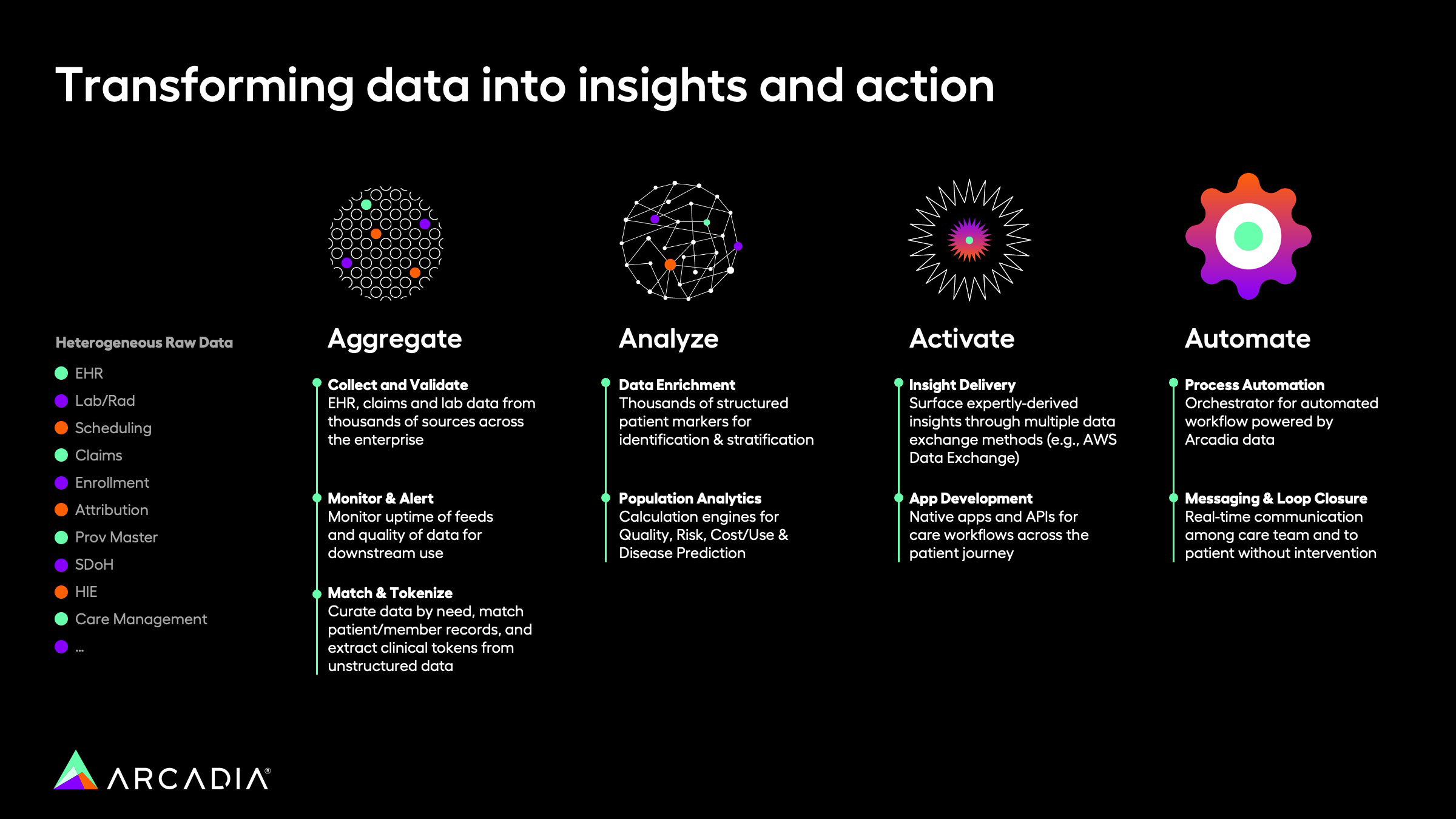 The first step in this four-part process is aggregation, gathering up all relevant and available data so it’s prepared for use. This means building a robust data foundation through raw, heterogenous sources like EHRs, labs, scheduling data, claims, enrollment, attribution, provider notes, SDoH information, HIE, care management, and more.