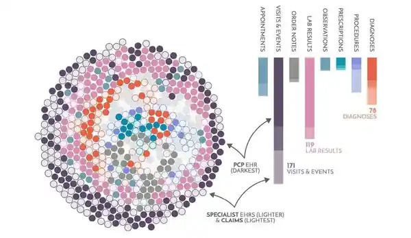 We traced the origin of every data element for a practice in Eastern Massachusetts. This is the average patient record across the integrated dataset, with unique elements highlighted based on their data source and type of information. View full graphic here.
