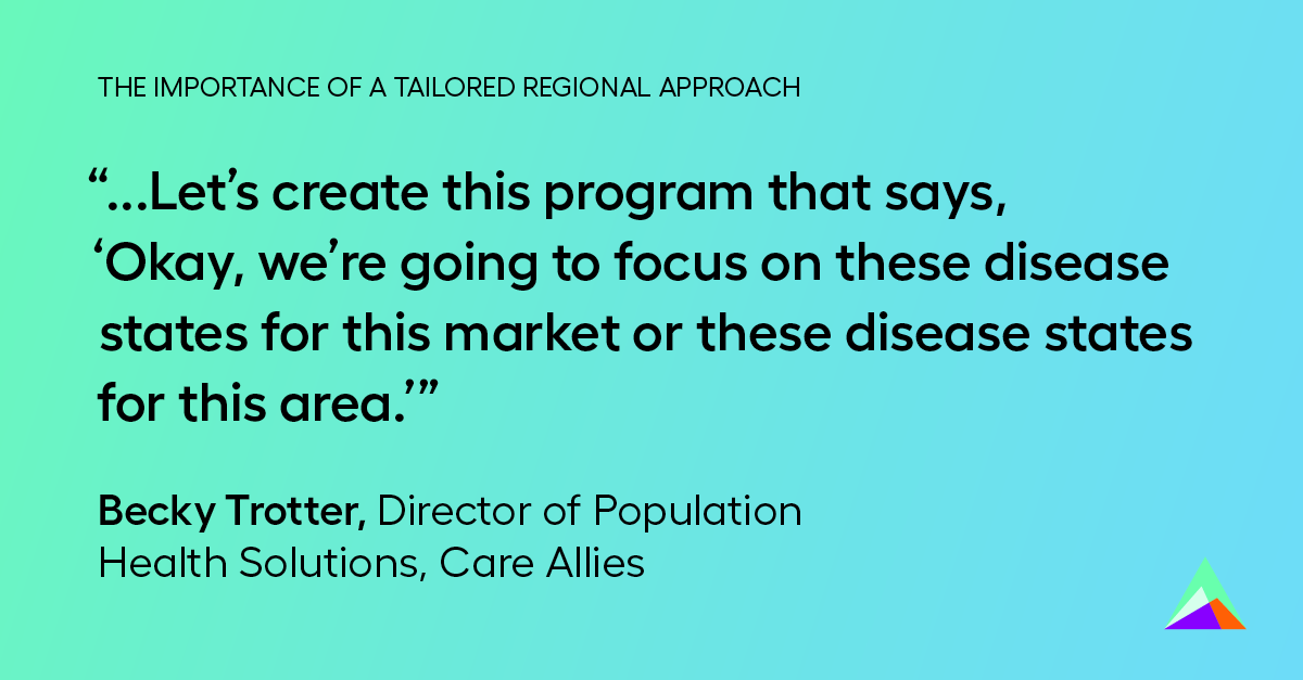 Fine-tuning your approach to the regions you serve is critical, whether you’re an ACO or working strictly under fee-for-service. As Becky Trotter points out, the best approach is often bespoke — tailored to each group’s unique needs, and not a universal checklist.