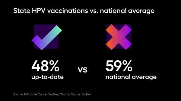 Rates of cancer in Florida are slightly higher than the US average.7 Certain statistics are even more variable — for example, only about 48% of Floridians were up-to-date on HPV vaccines as of 2021, compared to the national average of about 59%. As a chronic illness, cancer requires regular intervention and patient engagement. Education can prevent certain risky behaviors (like smoking)8, but screenings and routine care are key to avoid high costs.