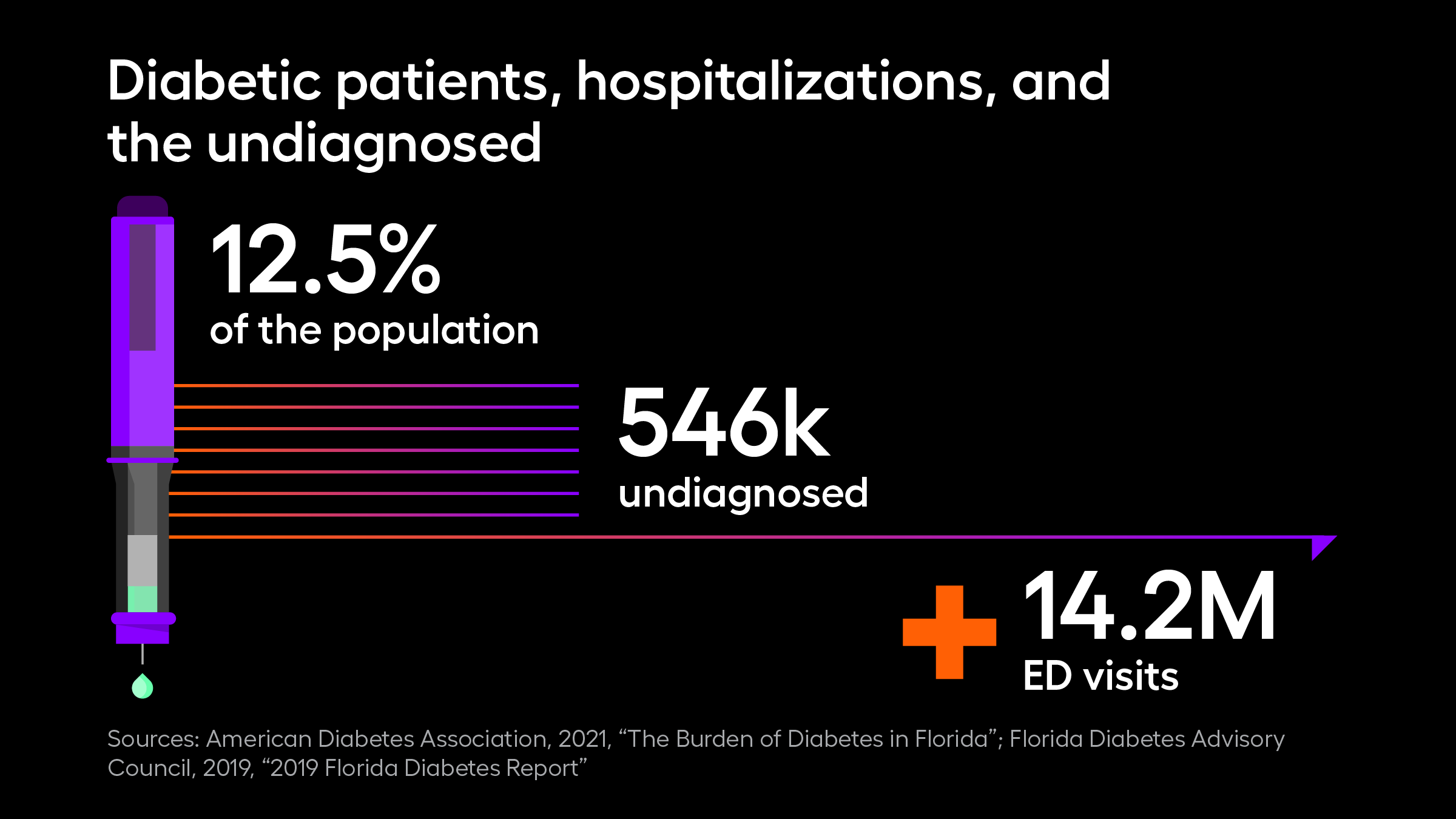 As of 2021, 12.5% of Florida’s population (that’s 2,164,009 people) had received a diabetes diagnosis. Another 546,000 likely have the disease but remain undiagnosed.3 Many serious comorbidities come with diabetes, from hypertension4 to ischemic heart disease.5 Most crucially, diabetes is a serious cause of hospitalizations, with 14.2 million ED visits due to diabetes in the state in 2014.6
