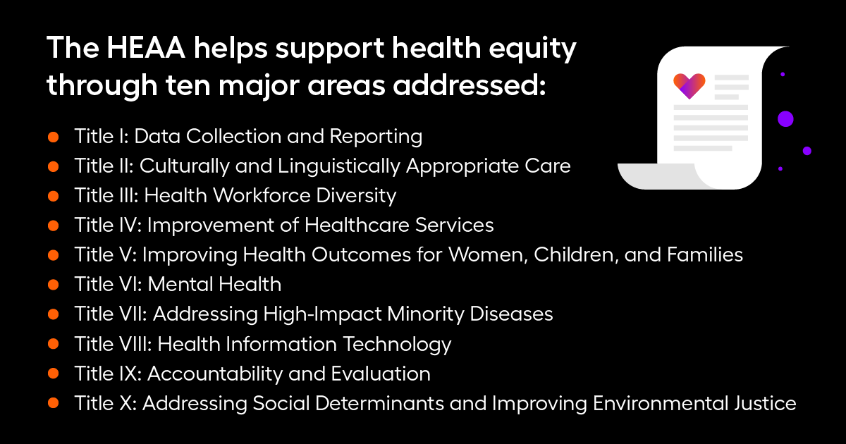 Passed in congress in 2022, the HEAA aims to reduce health inequity (or unequal access to and quality of healthcare). It changed eligibility requirements for Medicare and Medicaid, and it requires more detailed demographic and public health reporting. It also increases access to culturally literate, appropriate care across diverse communities.