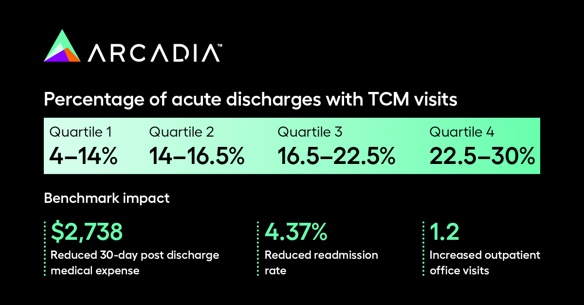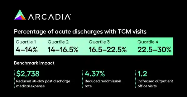 Arcadia’s ACO clients with exceptional MSSP results use Admission, Discharge, Transfer (ADT) data integrated with their Population Health Software to identify which patients have been discharged. They can see who has been assigned a TCM code and who hasn’t.