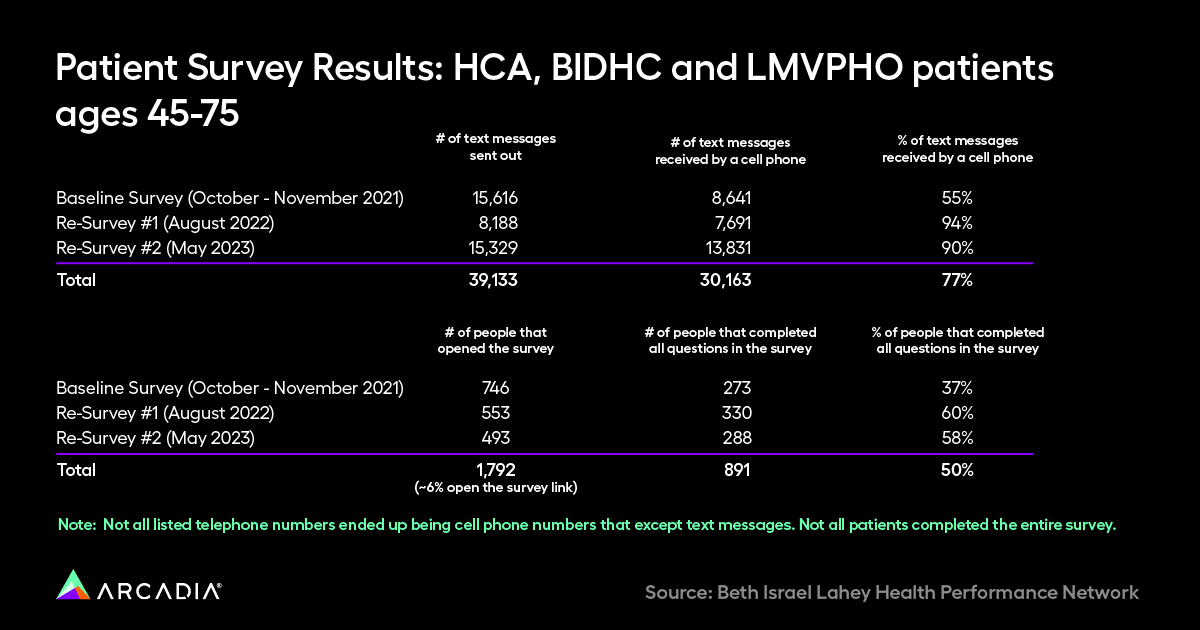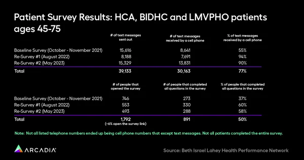 These options gave patients agency in their own healthcare journey, and critically, the freedom of choice was effective. A follow-up survey in May 2023 yielded a 58% completion rate, an improvement from the 37% in the baseline survey. There were eight different languages offered, from Portuguese to Italian, so that texts were tailored to their recipients. They also realized that while text messaging worked for certain demographics, certain demographics responded better to telephone calls.
