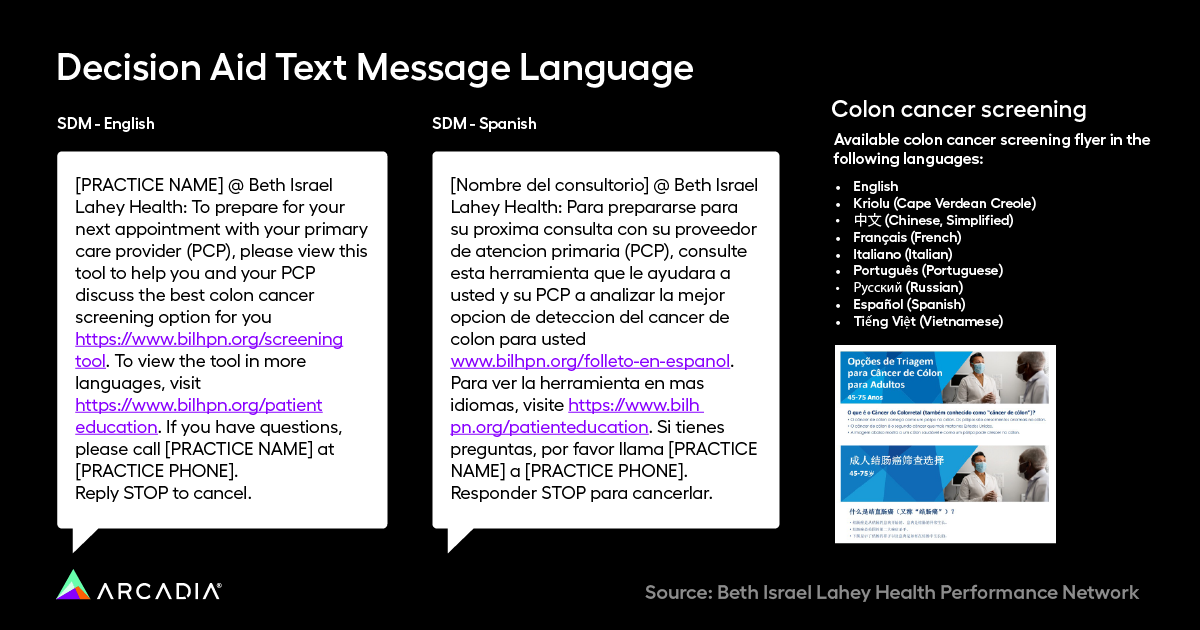 To embark on this program, BILH Performance Network used data analytics to curate a pool of text message recipients between 45 and 75, specifically listed as not having been compliant for a colorectal cancer screening. They also targeted those with upcoming primary care appointments within the next 30 days, so that they could follow through on any testing.